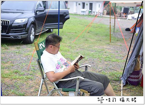 姑丈,很優閒的坐在天幕下看書!