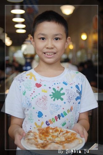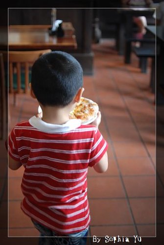 領到 pizza了, 每個小朋友 都要端pizza 回到自己的座位 好好享用