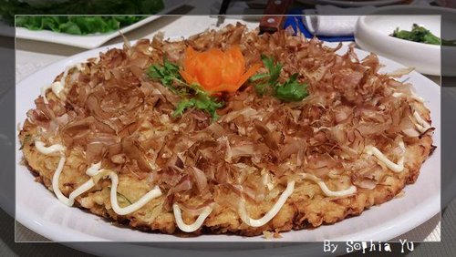 但是 這菜是 猶大豬覺得很好吃的 ~ 蔬菜餅 在餅上 還鋪滿了 柴魚片 ~