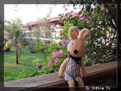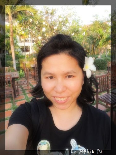 飯店有好多 雞蛋花,猶大豬也來學小恩一下。