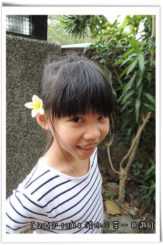 小恩 看到 掉在地上的雞蛋花,馬上去撿過來帶在頭上拍照。