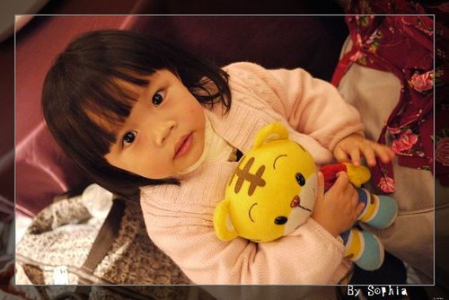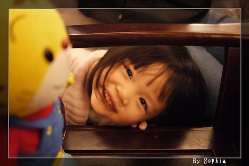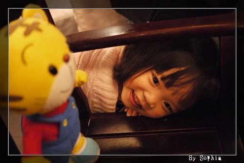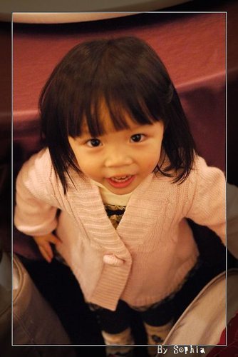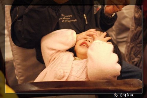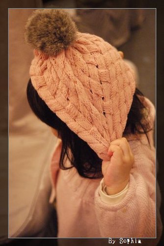 阿晴在餐廳吃飯,吃著吃著 就開始帶帽子想要出去外面玩了。
