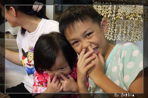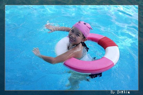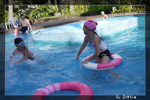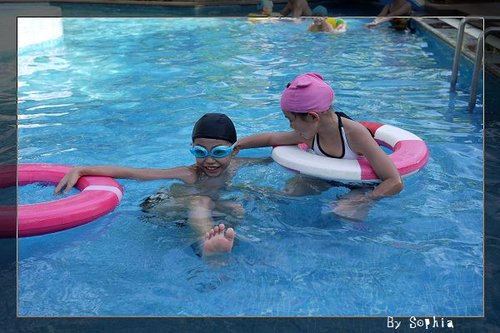 這兩兄妹 在 游泳池 玩的 很開心。