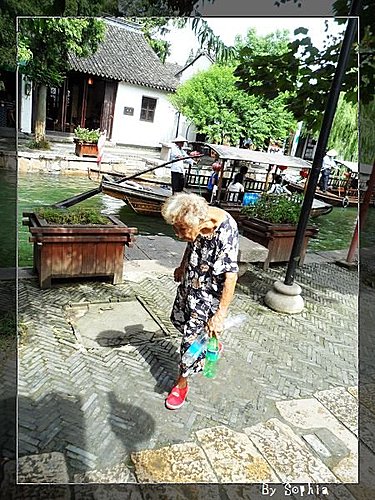 這個老太太,很勤奮的穿梭在這老街上 做環保。