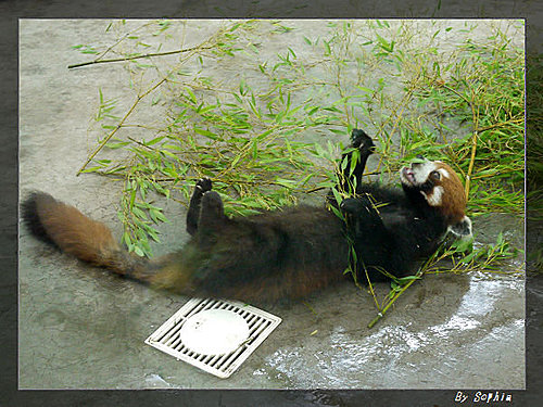 動物園另一個明星動物~小熊貓,居然躺在地上吃竹子,只能說:真是爽快阿。