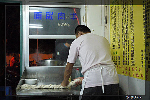 晚餐在賓館附近的蘭州拉麵吃拉麵,這裡的麵條是現拉的,還不賴,很好吃。