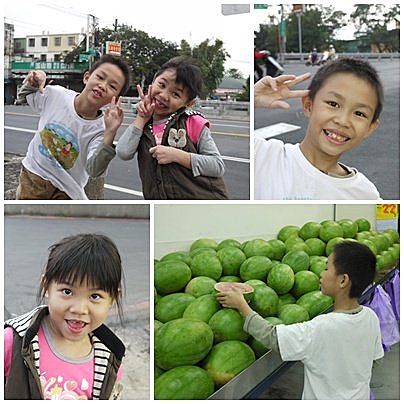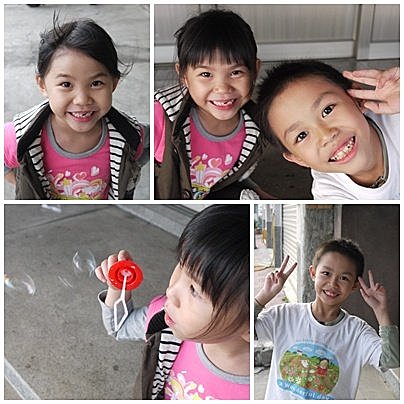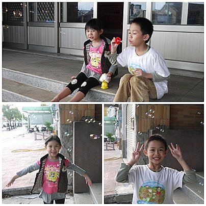 這兩兄妹總是有東西可以玩,在家門口玩起吹泡泡了。