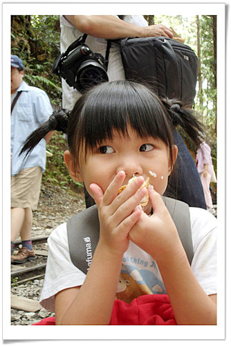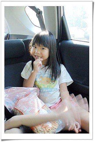 我們五點就出發摟,小恩妹妹在車上就已經拿出鱈魚香絲啃了。