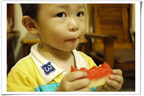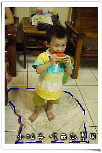 每回吃西瓜都叫他站在紙上或是大毛巾上。
