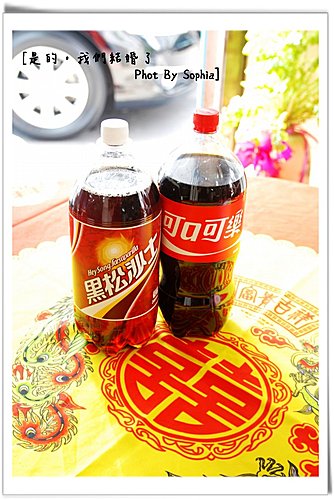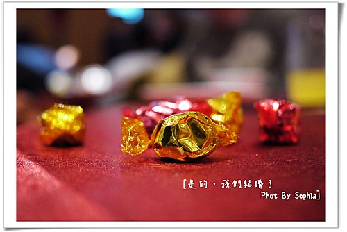 紅紅的桌巾鋪上金色紅色的喜糖,今天要讓大家都見證我們的愛情。