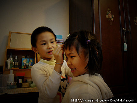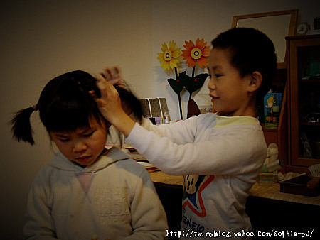只聽到小恩妹妹一直在慘叫阿,小威你也下手輕一點阿,妹妹的頭髮都要被你扯光了。