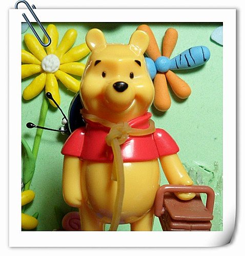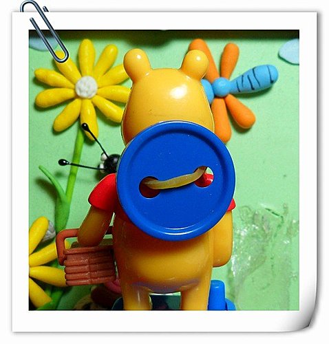 這是小熊維尼的正面,看起來像被"繩子綁住"。