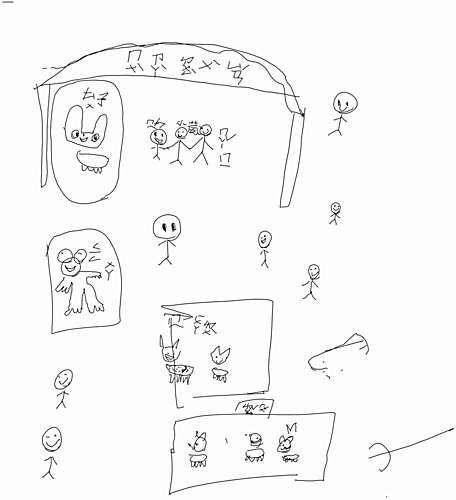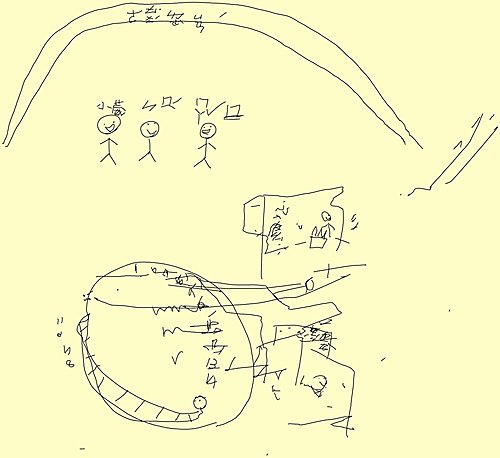 他說兒童樂園有大大的彩虹,有一堆攤販賣薯條,冰淇淋...