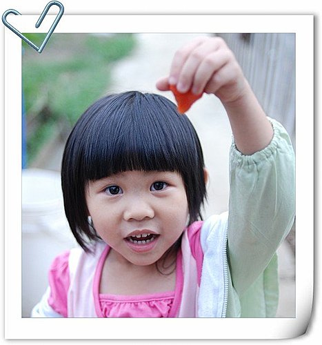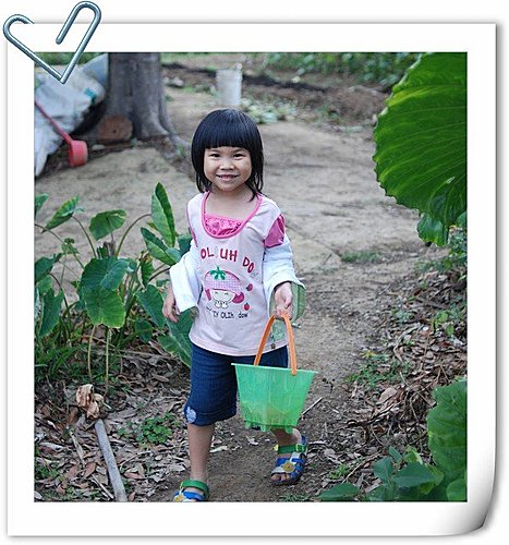 小恩妹妹今天不推推車了,今天拿著小水桶到處走,裡面裝了"番茄"還有"草莓"。