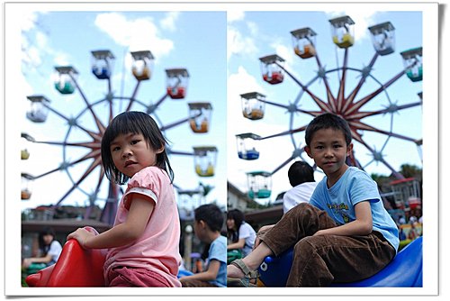 好不容易阿,我們終於到了兒童樂園,我們坐了摩天倫、咖啡杯,還有龍鳳船。