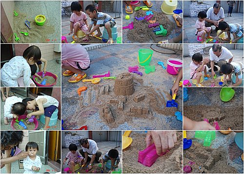 去之前舅媽就會幫他們準備好玩具,沙子還有腳踏車。