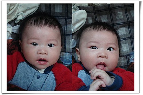 我的好朋友~小柚子,已經四個月了歐。他對照相機非常敏感,當我們拿著照相機,他就會盯著相機,看著看著就鬥雞眼了。