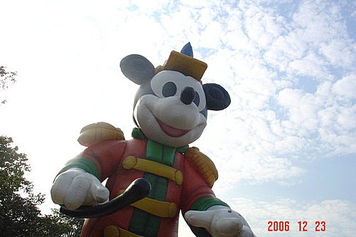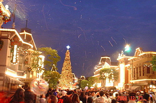 米老鼠把聖誕樹點燈了歐,天空還飄起人造雪ㄟ。