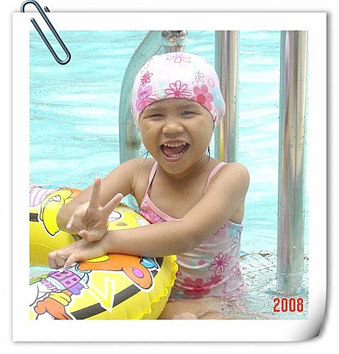 還是我,我想這個泳帽不是太好,因為她把我的大眼睛變成瞇瞇眼了,害我今天被笑了一整天!尤其是我舅舅校最大聲啦!