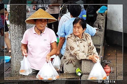 在 "放生橋" 的入口,有人 賣 金魚,讓人把魚放生。