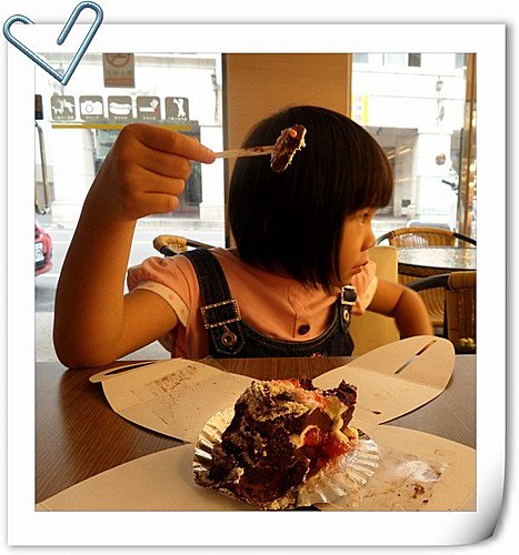 小恩吃著蛋糕,眼睛還看著櫥窗裡的蛋糕。
